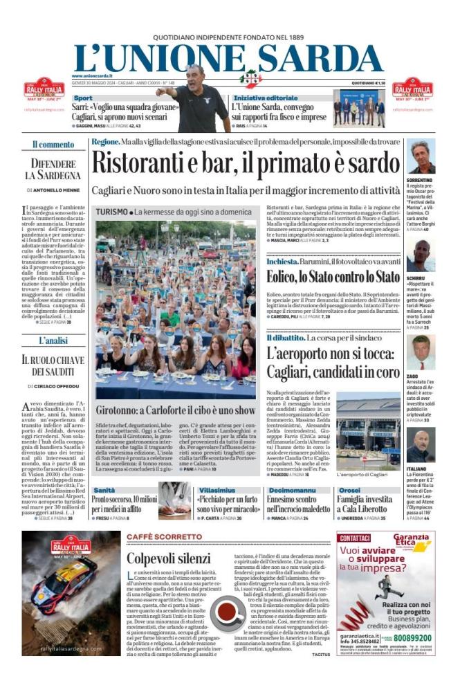"Sarri chiama, il Cagliari può rispondere", è il titolo nella prima sportiva. Le dichiarazioni del tecnico toscano aprono scenari suggestivi. Restano in ballo