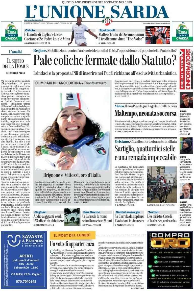 "E' la notte di Cagliari-Lecce. Gaetano e Ze Pedro ko, c'è Mina". Così titola in prima pagina L'Unione Sarda. Nella prima sportiva: "La notte del Cagliari. La sfida col Lecce vale come una finale". Alle 20:45 alla Domus c'è Di Francesco. Non ci sarà Gaetano, Ze Pedro in forse. in palio 3 punti pesanti in chiave salvezza.