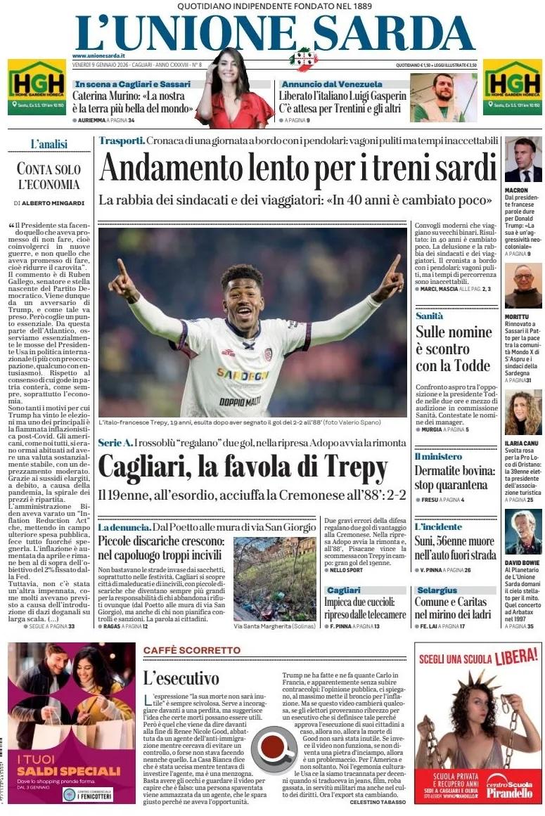 "Cagliari, la favola di Trepy", è il titolo che campeggia nella prima pagina de L'Unione Sarda con un'immagine in primo piano del giovane talento rossoblù. Il 19enne, all'esordio, acciuffa la Cremonese all'88': 2-2.