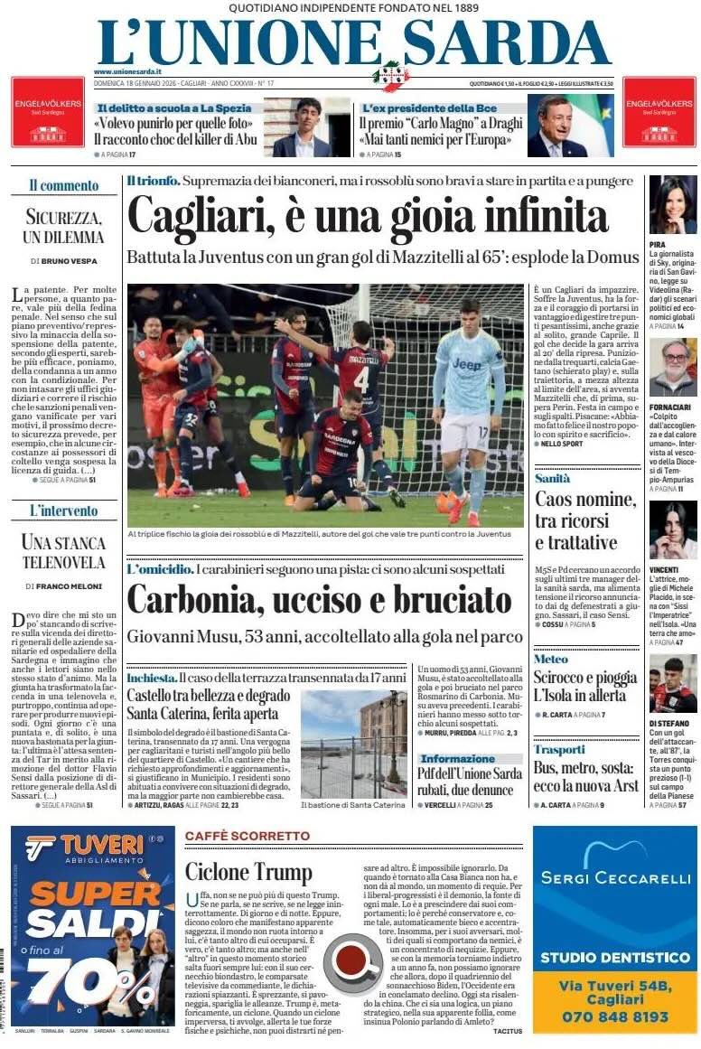 "Cagliari, una gioia infinita", è l'apertura de L'Unione Sarda. Battuta la Juventus con un gran gol di Mazzitelli al 65': esplode la Domus. Il trionfo. Supremazia dei bianconeri, ma i rossoblù sono bravi a stare in partita e a pungere.