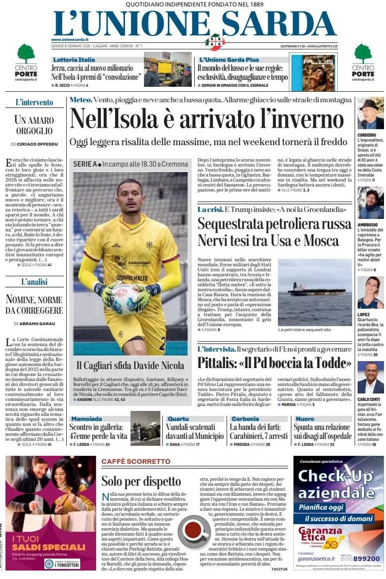 "Il Cagliari sfida Davide Nicola", titola in prima pagina L'Unione Sarda. In campo alle 18:30 a Cremona. Nella prima sportiva: "Cagliari, a Cremona il faccia. a faccia con Davide Nicola". Dopo il ko col Milan, oggi i rossoblù possono agganciare l'ex tecnico.