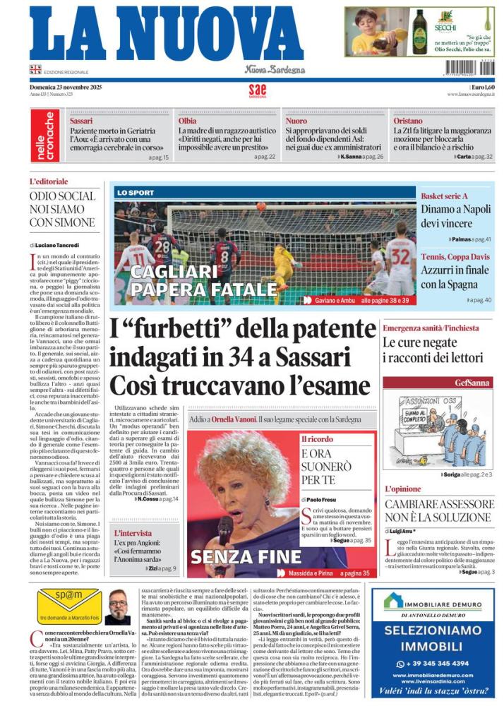 "Cagliari, papera fatale". Così titola in prima pagina La Nuova Sardegna. Nella prima sportiva: "Caprile tradisce il Cagliari". Un grave errore del portiere rossoblù favorisce il gol del pareggio del Genoa. Doppietta di Borrelli, a segno anche Seba Esposito, ma quanti errori difensivi. La squadra ha saputo reagire quando per due volte è andata sotto ma i tre punti mancano da oltre due mesi.