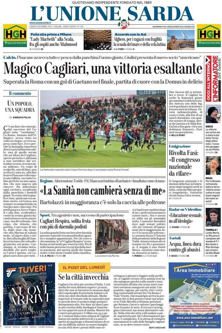 L'Unione Sarda dedica l'apertura all'impresa dei rossoblù contro la Roma: "Magico Cagliari, una vittoria esaltante", è il ttiolo a nove colonne del quotidiano. Superata la Roma con un gol di Gaetano nel finale, partita di cuore con la Domus in delirio. Pisacane azzecca tutto e pesca dalla panchina l'uomo giusto. Giulini presenta il nuovo socio "americano".