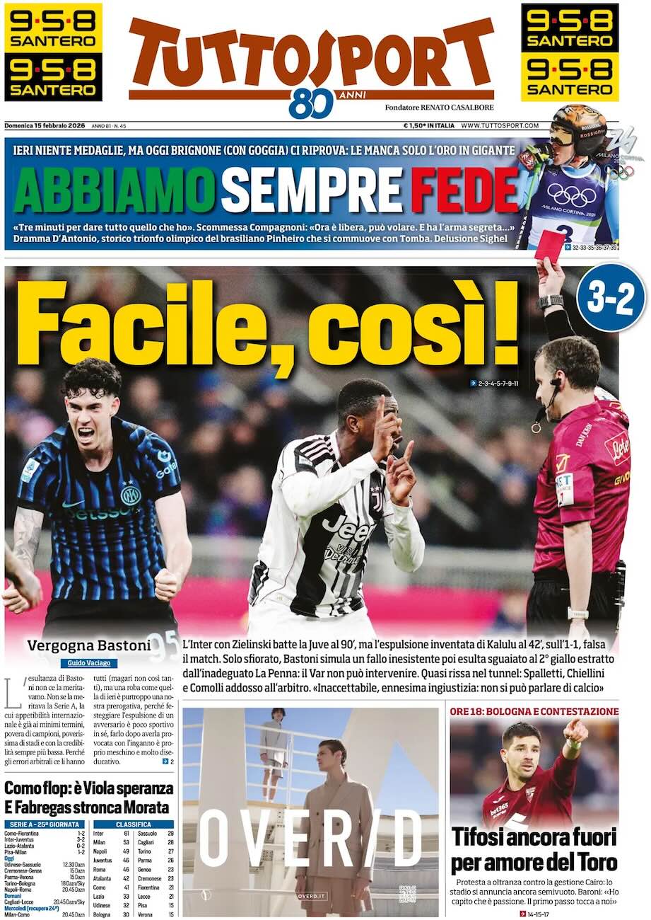 Tuttosport apre con il derby d'Italia, rovinato dall'arbitro La Penna: "Facile, così!", titola il quotidiano. L’Inter con Zielinski batte la Juve al 90’, ma l’espulsione inventata di Kalulu al 42’, sull’1-1, falsa il match. Solo sfiorato, Bastoni simula un fallo inesistente poi esulta sguaiato al 2° giallo estratto dall’inadeguato La Penna: il Var non può intervenire. Quasi rissa nel tunnel: Spalletti, Chiellini e Comolli addosso all’arbitro. «Inaccettabile, ennesima ingiustizia: non si può parlare di calcio».