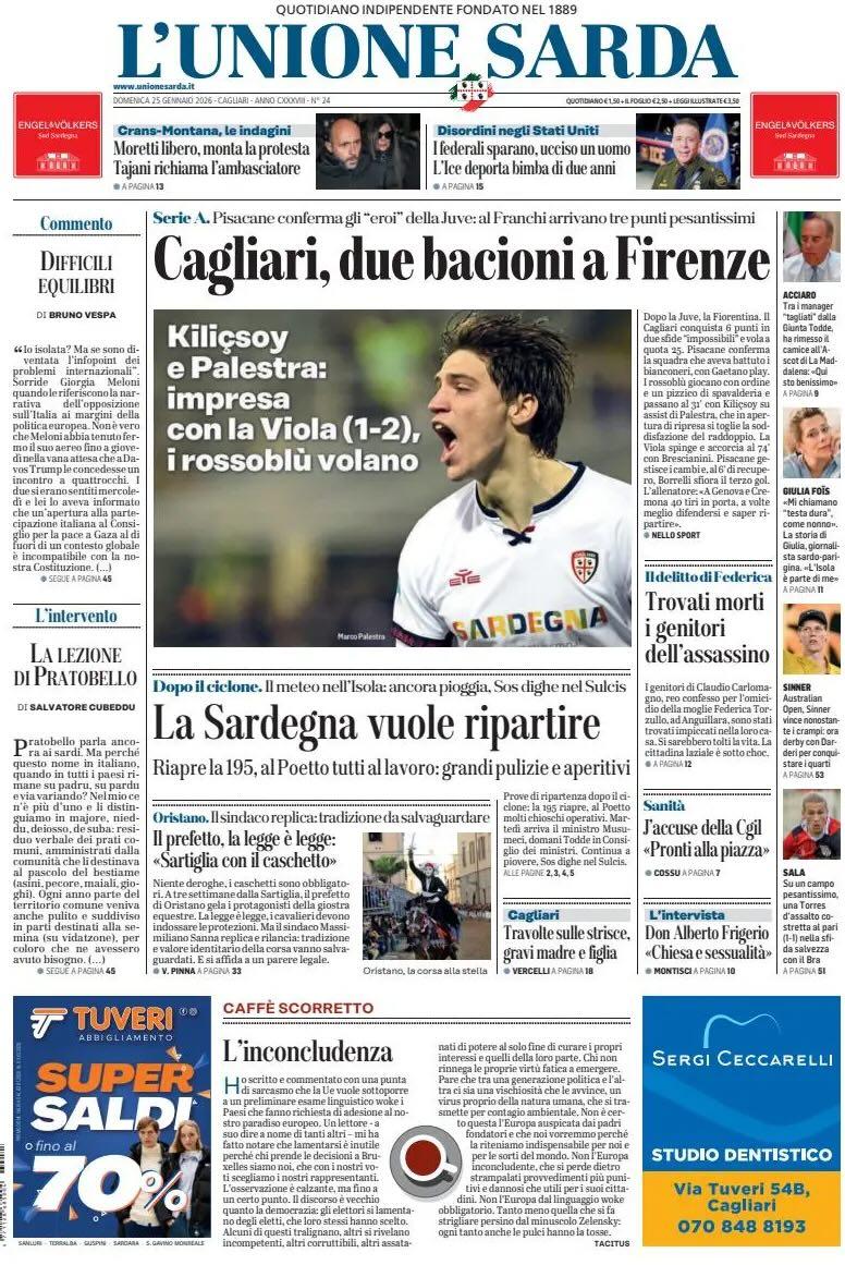 "Cagliari, due bacioni a Firenze". Così apre l'edizione odierna de L'Unione Sarda. Kiliçsoy e Palestra: impresa con la Viola (1-2), i rossoblù volano. Pisacane conferma gli "eroi" della Juve: al Franchi arrivano tre punti pesantissimi.