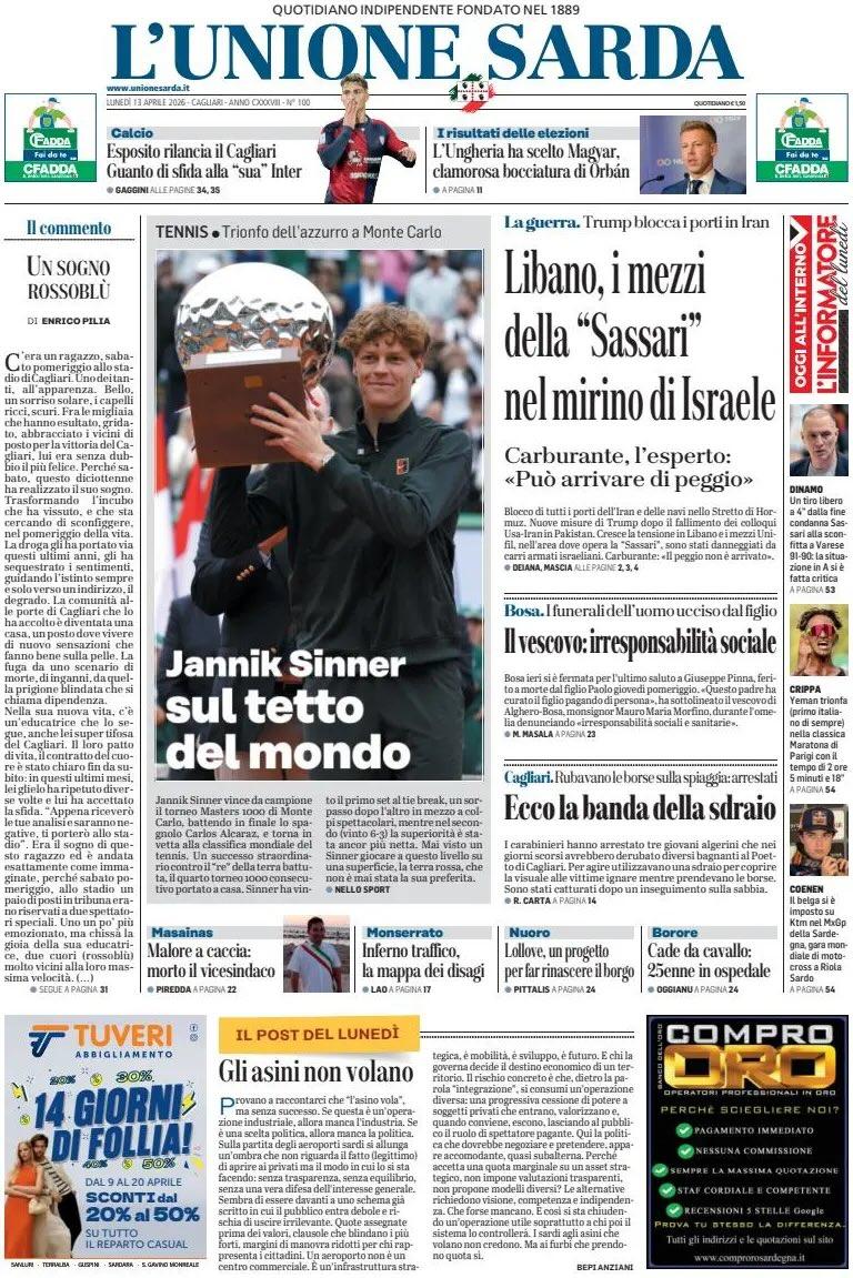 "Esposito rilancia il Cagliari. Guanto di sfida alla 'sua' Inter". Così titola L'Unione Sarda in prima pagina. Nella prima sportiva: "Cagliari, Esposito decisivo. Anche il Lecce scivola a -6". Grazie all'1-0 di sabato sulla Cremonese e al ko di ieri del Lecce, il Cagliari respira a +6 sulla zona retrocessione. Sempre più decisivo Esposito, con 6 gol. E venerdì sfida la "sua Inter".