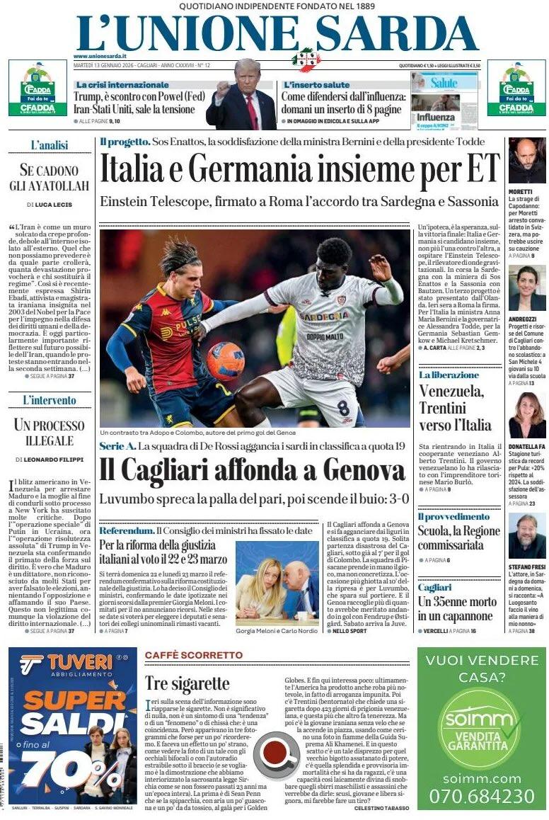 "Il Cagliari affonda a Genova", titola in prima pagina L'Unione Sarda Luvumbo spreca la palla del pari, poi scende il buio: 3-0. La squadra di De Rossi aggancia i sardi in classifica a quota 19.