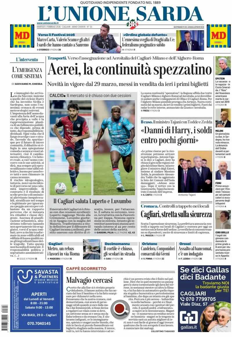 "Il Cagliari saluta Luperto e Luvumbo", titola in prima pagina L'Unione Sarda. Il mercato si è chiuso con due cessioni. Nella prima sportiva: "Cagliari, Luperto cede alla corte di Nicola. Luvumbo al Maiorca, Zappa non si muove.