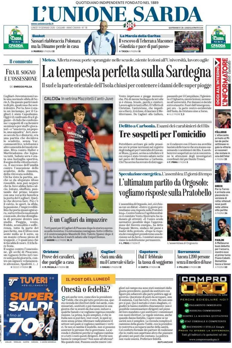 "E' un Cagliari da impazzire", titola in prima pagina L'Unione Sarda. In vetrina Mazzitelli, l'anti-Juve. Nella prima sportiva: "Cagliari da favola, adesso tornano gli scontri diretti", La squadra è su di giri e i tifosi sono entusiasti dopo storico successo di sabato sulla Juventus. in vetrina Pisacane e il match-winner Mazzitelli.