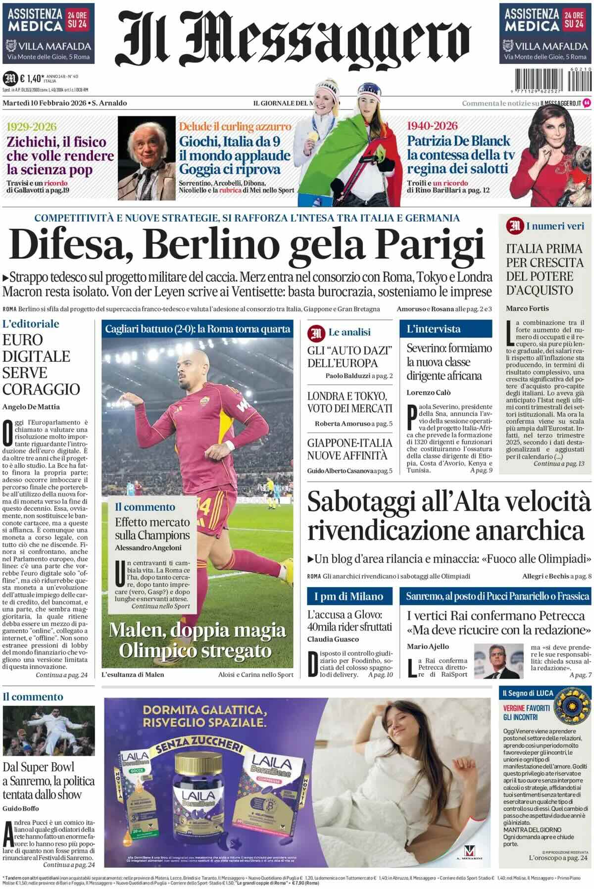 "La Roma di Malen torna a correre". Così si aprono le pagine sportive de Il Messaggero. Cagliari battuto 2-0. Prestazione super e due reti del centravanti. Il primo gol con un cucchiaio davanti a Totti presente in tribuna. Agganciata la Juve al quarto posto. Buon debutto per Zaragoza. l'allenatore ha trovato la punta di cui aveva bisogno. Svilar imbattuto per la undicesima volta in campionato.