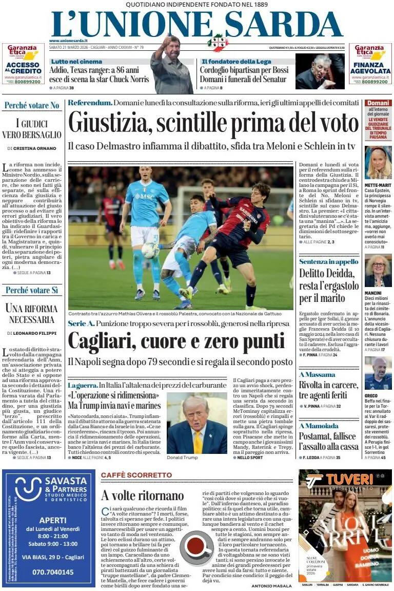 "Cagliari, cuore e zero punti", è il titolo in evidenza nella prima pagina de L'Unione Sarda. Il Napoli segna dopo 79 secondi e si regala il secondo posto. Punizione troppo severa per i rossoblù, generosi nella ripresa.