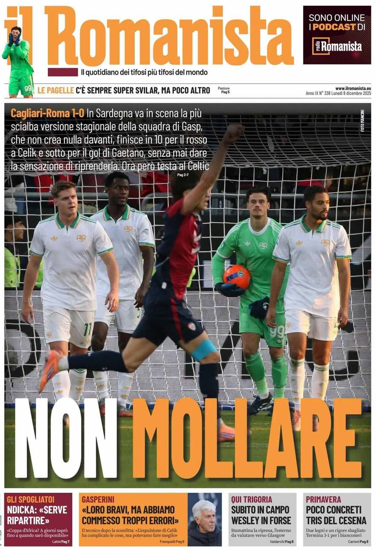 "Non mollare", è l'apertura de Il Romanisra. Cagliari-Roma 1-0. In Sardegna va in scena la più scialba versione stagionale della squadra di Gasp, che non crea nulla davanti, finisce in 10 per il rosso a Celik e sotto per il gol di Gaetano, senza mai dare la sensazione di riprenderla. Ora però testa al Celtic.