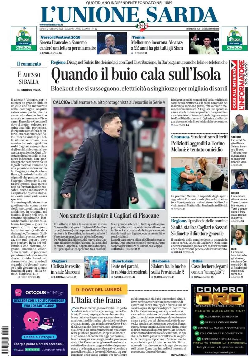 "Non smette di stupire il Cagliari di Pisacane". Questo il titolo nella prima pagina de L'Unione Sarda. L'allenatore subito protagonista all'esordio in Serie A.